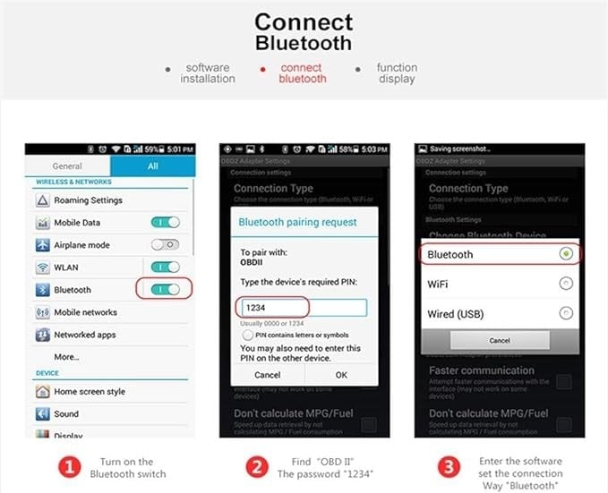 - كيفية الاستخدام: قم بتوصيل الجهاز في منفذ OBD2 في سيارتك وقم بتشغيل السيارة وتمكين البلوتوث على الجوال أو التابلت وابحث عن "OBDII" وأقرن به (الرقم السري 1234)، وشغل التطبيق الذي قمت بتحميله بإعدادات بسيطة وانتظر حتى يتصل بجهاز ECU الخاص بسيارتك بنجاح. إذا كنت تستخدم نفس جهاز OBD على سيارتين أو أكثر، فأنت بحاجة إلى فصل البلوتوث وإغلاق التطبيق عند الانتهاء من اختبار سيارة واحدة، وإعادة مطابقة البلوتوث عند إدخال جهاز OBD في سيارة أخرى.